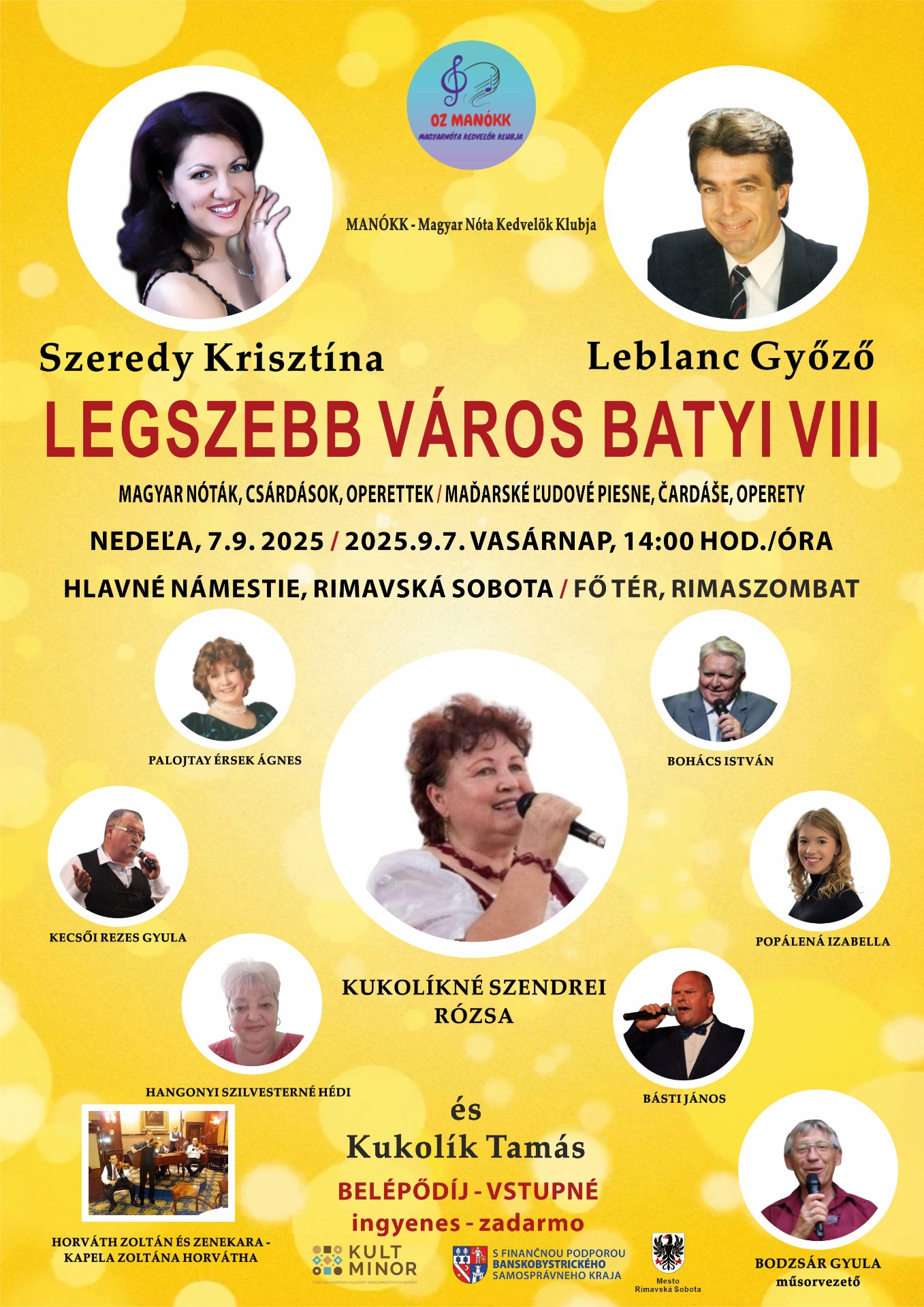2023 szeptember 2-án, szombaton 15.00 órától Nótaestet rendezünk: Legszebb város Batyi 6 címmel, a rimaszombati Városi Művelődési Központban. Az est során magyar nóták, operettek és ismert operaáriák hangzanak el.